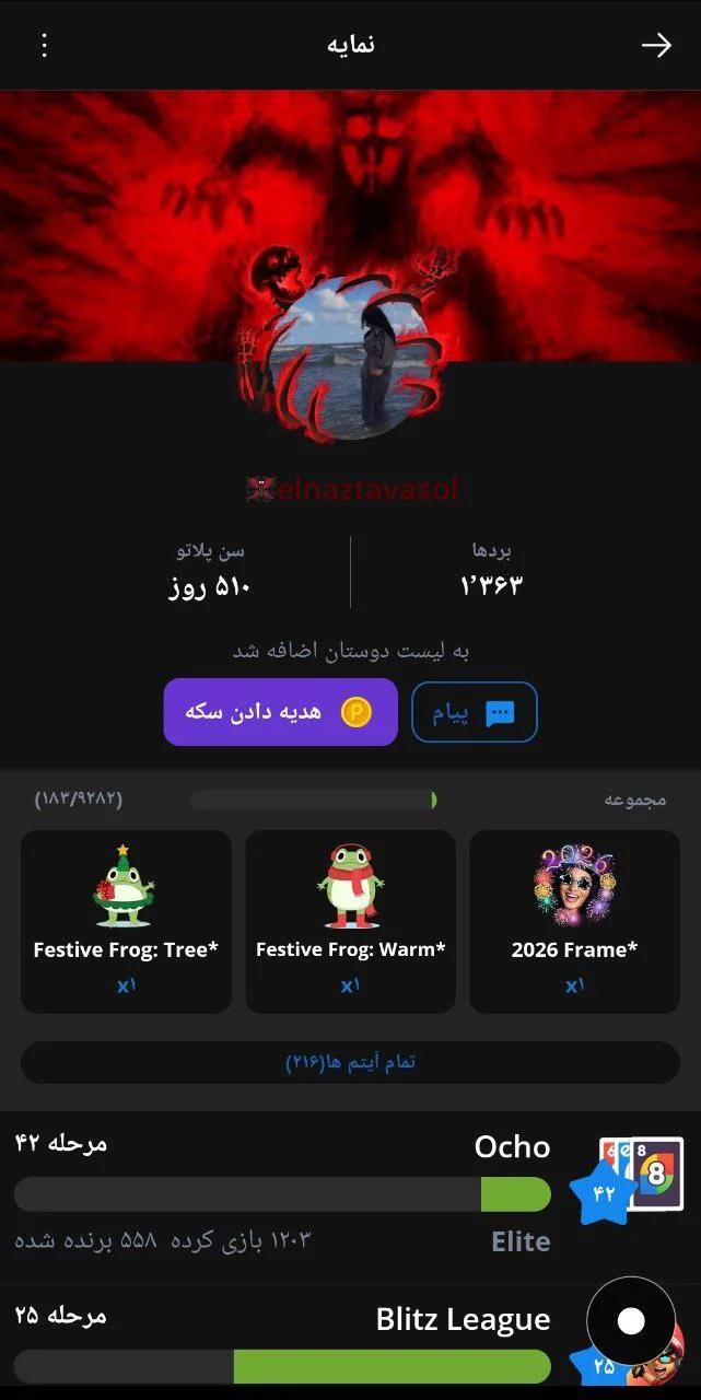 ۲۱۶ ایتم داره که از ۸۰۰ تومنم بیشتر میارزه و چند استیکری که نه توی فروشگاه هست نه سایت و کلی آیتم هایی که میارزه به خریدنش